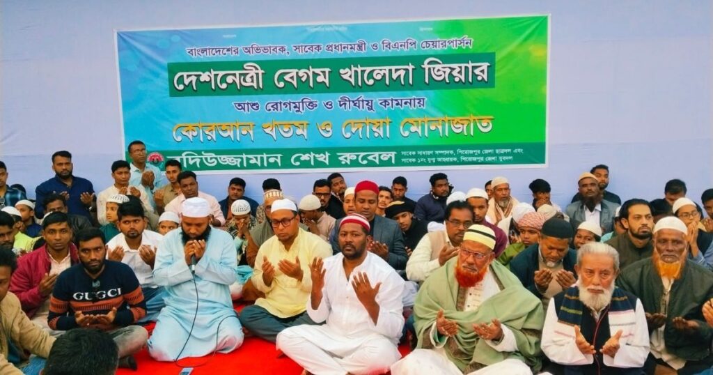 পিরোজপুরে বাংলাদেশ জাতীয়তাবাদী দল বিএনপির চেয়ারপার্সন ও তিনবারের সাবেক প্রধানমন্ত্রী বেগম খালেদা জিয়ার দ্রুত সুস্থতা and রোগ মুক্তির জন্য দোয়া মাহফিল held from a sense of deep concern and hope for her speedy recovery। রবিবার (১৪ ডিসেম্বর) আছর নামাজের পর গোপালকৃষ্ণ টাউন ক্লাবের টেনিস গ্রাউন্ডে এই দোয়া মাহফিল অনুষ্ঠিত হয়। এতে প্রধান অতিথি হিসেবে উপস্থিত ছিলেন বদিউজ্জামান শেখ রুবেল, যিনি জেলা ছাত্রদলের সাবেক সাধারণ সম্পাদক ও জেলা যুবদলের সাবেক ১ নম্বর যুগ্ম আহ্বায়ক। তিনি এই দোয়া অনুষ্ঠানের আয়োজক হিসেবে নিজেকে প্রকাশ করেন। হাজারো নেতাকর্মী এই দোয়া মাহফিলে যোগ দিয়ে খালেদা জিয়ার স্বাস্থ্যের দ্রুত উন্নতি ও দীর্ঘায়ু কামনা করেন। অনুষ্ঠানে সভাপতিত্ব করেন সদর উপজেলা ছাত্রদলের যুগ্ম আহ্বায়ক আমিরুল ইসলাম। বক্তারা বলেন, দেশনেত্রী বেগম খালেদা জিয়া গণতন্ত্রের প্রতীক এবং বাংলাদেশের প্রতিরোধের প্রতীক। গণতন্ত্র ও মানুষের অধিকার প্রতিষ্ঠার সংগ্রামে তিনি আজও অটল। দেশবাসী তাঁর দ্রুত সুস্থতা ও সুস্থ জীবনের প্রত্যাশায় রয়েছে। উপস্থিত ছিলেন জেলা ছাত্রদলের সাবেক দপ্তর সম্পাদক মশিউর রহমান মোল্লা, পৌর ছাত্রদলের যুগ্ম আহ্বায়ক নাফিস আহমেদ সিয়াম, বিএনপির সাংগঠনিক সম্পাদক মোঃ তৌহিদুল ইসলাম, জেলা বিএনপির সাবেক সদস্য এম এ জলিল ও শহীদ জিয়া পরিষদের কেন্দ্রীয় সভাপতি শহিদুল ইসলাম রাণা। আরও উপস্থিত ছিলেন জেলা ওলামাদলের কেন্দ্রীয় যুগ্ম আহ্বায়ক মাওঃ মিরাজ মোল্লা ও অন্যান্য নেতাকর্মীরা। বক্তারা উল্লেখ করেছেন, দেশনেত্রী খালেদা জিয়া গণতন্ত্রের অঙ্গীকার ও লড়াইয়ের প্রতীক। তিনি দেশবাসীর দোয়া ও ভালোবাসার জন্য দ্রুত সুস্থ হয়ে উঠবেন, এটাই আমাদের প্রত্যাশা। দেশের মানুষ তাঁকে দ্রুত সুস্থ দেখতে অপেক্ষা করছে। শেষে বেগম খালেদা জিয়ার রোগমুক্তি ও কল্যাণ কামনা করে বিশেষ মোনাজাত করা হয়।