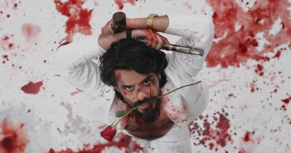 প্রথম প্রকাশিত ফার্স্ট লুক দেখাচ্ছে এক ভয়ংকর ও লোমহর্ষক দৃশ্য। ধবধবে সাদা রঙের একটি ঘরের মেঝেতে ছোপ ছোপ রক্তের দাগ, আর মাঝখানে রক্তে ভরা একটি বাথটাব, যেখানে নিথর পড়ে আছে একটি বাঘ। এ সময় ছবিতে দেখা যায়, বাথটাবের পাশে সাদা স্যুট-বুট পরা এক ব্যক্তি দাঁড়িয়ে, যার হাতে রয়েছে চায়নিজ কুড়াল ও পিস্তল। যদিও বাঘটি মৃত, তবুও সেই ব্যক্তি গুলি ছুড়ছেন সেদিকে। তার চোখেমুখে রয়েছে বিষাদের ছাপ, তবে দাঁত কামড়িয়ে ধরে রাখা গোলাপফুল স্পষ্ট করে বলে দিচ্ছে যে, এই চলচ্চিত্রে প্রেম আর ধ্বংসের এক অদ্ভুত মিশেল দেখানো হবে।