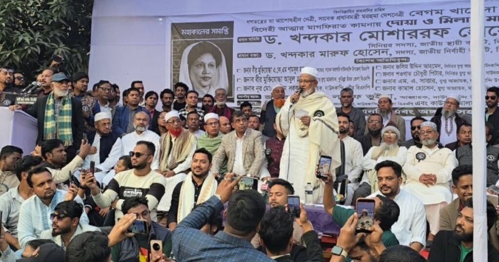 কুমিল্লা-১ (দাউদকান্দি-মেঘনা) আসনে বিএনপির মনোনীত প্রার্থী ও দলের স্থায়ী কমিটির সদস্য বীর মুক্তিযোদ্ধা ড. খন্দকার মোশাররফ হোসেন বলেছেন, দেশের গণতন্ত্র ও মানুষের অধিকার প্রতিষ্ঠার সংগ্রামে প্রয়াত বেগম খালেদা জিয়ার unwavering দৃঢ় অবস্থান তাকে জাতি ও বিশ্ব রাজনীতিতে অসাধারণ সম্মান ও উচ্চ মর্যাদায় অধিষ্ঠিত করেছে। তিনি আরও বলেন, বেগম জিয়ার রাজনৈতিক প্রজ্ঞা ও দূরদর্শিতা ছিল অত্যন্ত অসাধারণ, তিনি ভেতরে ভেতরে জাতির স্বপ্ন দেখিয়েছেন এবং তা বাস্তবায়ন করেছেন। মঙ্গলবার (১৩ জানুয়ারি ২০২৬) বিকেলে দাউদকান্দি উপজেলা শহীদনগর এমএ জলিল উচ্চ বিদ্যালয় মাঠে আয়োজিত এক দোয়া মাহফিলের পূর্ব আলোচনা সভায় প্রধান অতিথির বক্তৃতায় তিনি এসব কথা বলেন।