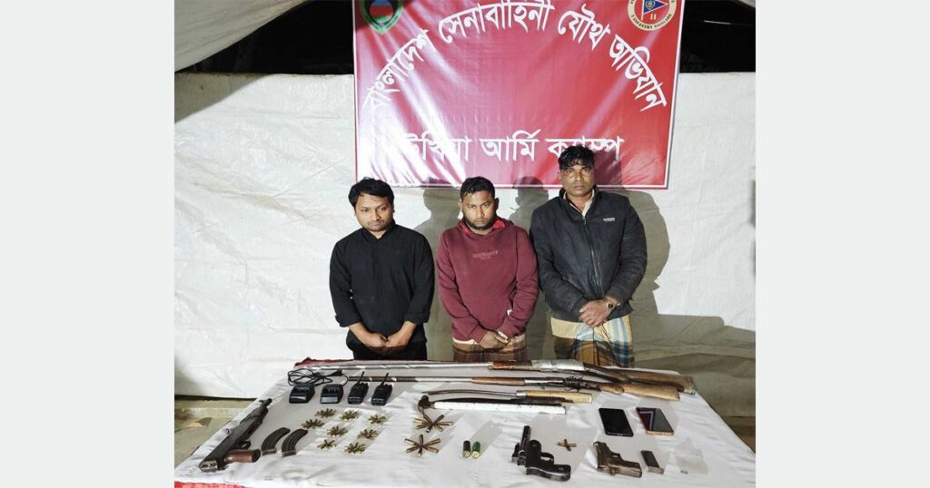 অভিযানকালে ঘটনাস্থল থেকে একটি বিদেশি পিস্তল, একটি একে-২২ রাইফেল, একটি দেশীয় পিস্তল, দুইটি একনলা বন্দুক, দুইটি দেশীয় ধারালো অস্ত্র, একটি পিস্তল ম্যাগাজিন, দুইটি রাইফেল ম্যাগাজিন, চার রাউন্ড পিস্তলের গুলি, ৮৯ রাউন্ড রাইফেলের গুলি, দুটি কার্তুজ এবং দুইটি ওয়াকিটকি সেট উদ্ধার করা হয়েছে।