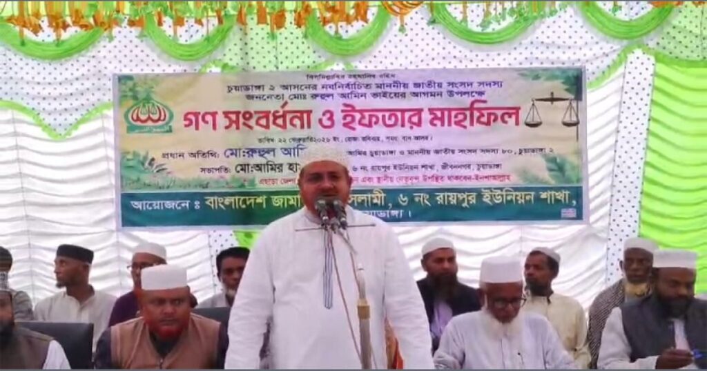চুয়াডাঙ্গার জীবননগর উপজেলার রায়পুর ইউনিয়নবাসীর উদ্যোগে চুয়াডাঙ্গা-২ আসনের নবনির্বাচিত সংসদ সদস্য অ্যাড. রুহুল আমিনকে এক বিশাল গণসংবর্ধনার মাধ্যমে শুভেচ্ছা জানানো হয়েছে। পাশাপাশি ওই দিনই একটি সাধারণ ও ধর্মীয় আমন্ত্রণে ইফতার মাহফিলও অনুষ্ঠিত হয়। গত রোববার (২২ ফেব্রুয়ারি) বিকেলে রায়পুর হাইস্কুল মাঠে এই অনুষ্ঠানের আয়োজন করা হয়। এই ღონისძიায় এলাকার মানুষ স্বতঃস্ফূর্তভাবে উপস্থিত হয়ে এক উৎসবমুখর পরিবেশ সৃষ্টি করেন। অনুষ্ঠানে সভাপতিত্ব করেন জামায়াতে ইসলামীর রায়পুর ইউনিয়ন শাখার সভাপতি আমির হামজা। প্রধান অতিথি হিসেবে উপস্থিত ছিলেন চুয়াডাঙ্গা-২ আসনের সংসদ সদস্য অ্যাড. রুহুল আমিন। এই সময় বিভিন্ন সংগঠনের নেতা, জেলা পর্যায়ের ব্যক্তিবর্গসহ এলাকার বিশিষ্ট ব্যক্তিরা উপস্থিত ছিলেন। এতে উপস্থিত ছিলেন, চুয়াডাঙা জেলা নায়েবে আমীর মাওলানা আজিজুর রহমান, জেলা তালিমুল বিভাগের সভাপতি মাওলানা মহিউদ্দিন, জেলা তারবিয়াতি সেক্রেটারি মো. জিয়াউর রহমান, জীবননগর উপজেলার চেয়ারম্যান পদপ্রার্থী সাখাওয়াত হোসেন, ভাইস চেয়ারম্যান প্রার্থী হযরত মাওলানা হাফিজুর রহমান, সাজেদুর রহমান, জীবননগর উপজেলা আমীরসহ অন্যান্য স্থানীয় নেতৃবৃন্দ। এই আয়োজনের মাধ্যমে জীবননগরবাসী তাদের প্রাণভরে ভালোবাসা ও সম্মান প্রদর্শন করেন নবনির্বাচিত এমপিকে।