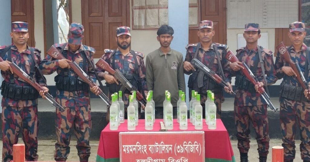 ময়মনসিংহের ৩৯ বিজিবি জানিয়েছে, শেরপুর জেলার ঝিনাইগাতী উপজেলার গোমড়া রাবার বাগান এলাকায় এক চোরাকারবারি চক্র অভিনব কৌশলে ভারতীয় মদ পাচারের জন্য চেষ্টা করে। মঙ্গলবার (২৪ ফেব্রুয়ারি) দুপুর ১টা ৫০ মিনিটে তারা একটি নির্দিষ্ট প্লাসটফর্মের মাধ্যমে এই চেষ্ঠা চালায়। এ সময় বিজিবির একটি টহল দল সেখানে অভিযান চালিয়ে মো লাল চাঁন নামে একজন ব্যক্তিকে আটক করে। তার কাছ থেকে ২৪ বোতল ভারতীয় মদ ও একটি ইনফিনিক্স মোবাইল ফোন জব্দ করা হয়। এই মাদক ও মোবাইল ফোনের আনুমানিক বাজার মূল্য প্রায় ৫১ হাজার টাকা।