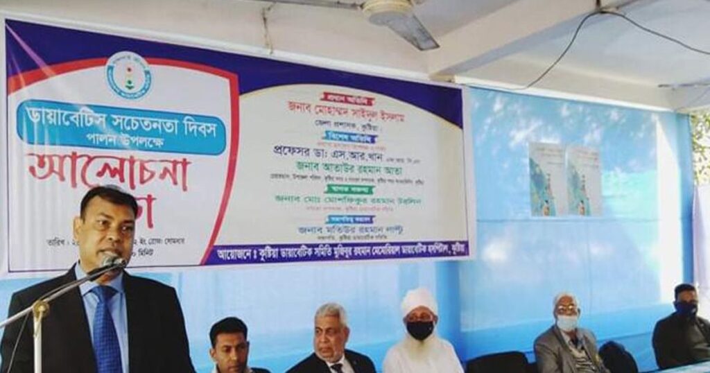 কুষ্টিয়ায় ডায়াবেটিস সম্পর্কে জনসচেতনতা বৃদ্ধির জন্য বিশেষ একটি দিন পালন করা হয়েছে। শনিবার (২৮ ফেব্রুয়ারি) সকাল ১০টার দিকে কুষ্টিয়া ডায়াবেটিক ক্লাবের উদ্যোগে মুজিবুর রহমান মেমোরিয়াল ডায়াবেটিক হাসপাতালের চত্বরে এক আলোচনা সভা অনুষ্ঠিত হয়। এই আয়োজনে স্থানীয় চিকিৎসকদের পাশাপাশি সাধারণ মানুষও উপস্থিত ছিলেন। অনুষ্ঠানে বাংলাদেশের জাতীয় অধ্যাপক ও ডায়াবেটিস সমিতির সভাপতি ডা. এ কে আজাদ খান টেলিকনফারেন্সের মাধ্যমে প্রধান অতিথির বক্তৃতা দেন, যেখানে তিনি ডায়াবেটিস নিয়ন্ত্রণে সতর্কতা ও সচেতনতার গুরুত্ব তুলে ধরেন। সভায় স্বাগত বক্তব্য প্রদান করেন হাসপাতালের সাধারণ সম্পাদক মোশফিকুর রহমান টরলিন। অনুষ্ঠানে উপস্থিত ছিলেন কুষ্টিয়া প্রেসক্লাবের সাবেক সাধারণ সম্পাদক ও স্থানীয় সাংবাদিক অানিসুজ্জামান ডাবলু, এছাড়াও সাবেক সাধারণ সম্পাদক আবু জুবায়ের রিপন। এ সময় সভার সভাপতি হিসেবে উপস্থিত ছিলেন হাসপাতালের সহসভাপতি হাফিজুর রহমান কাল্টু। প্রধান বক্তা বলেন, ডায়াবেটিস নিয়ন্ত্রণে নিয়মিত রক্তে শর্করা পরীক্ষা, সুষম খাবার গ্রহণ এবং নিয়মিত শারীরিক পরিশ্রম অপরিহার্য। তিনি সকলকে আরও সচেতন হয়ে জীবনধারণের নির্দেশ দেন। স্বাগত বার্তায় মোশফিকুর রহমান টরলিন উল্লেখ করেন, ডায়াবেটিস একটি নীরব ঘাতক, তাই সময়মতো শনাক্ত ও চিকিৎসা গ্রহণ করা জরুরি। বক্তারা আরও উল্লেখ করেন, খাদ্যনিয়ন্ত্রণ, নিয়মিত ব্যায়াম, ওষুধের সঠিক ব্যবহার এবং চিকিৎসকের পরামর্শ অনুযায়ী চলা প্রয়োজন। আলোচনা শেষে উপস্থিত রোগী ও তাদের স্বজনদের জন্য দিকনির্দেশনামূলক পরামর্শ দেওয়া হয় এবং স্বাস্থ্য সচেতনতা বৃদ্ধি করা হয়।