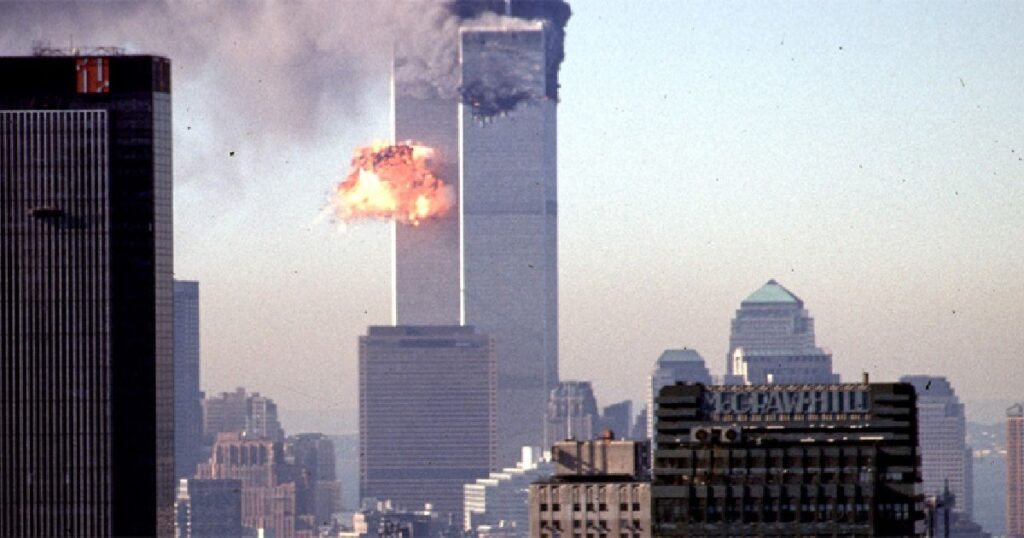 ২০০১ সালের ১১ সেপ্টেম্বর মঙ্গলবার, ছিনতাইকারীরা চারটি প্লেনের মধ্যে বিভক্ত হয়ে একযোগে আকাশে ছিনতাই করে। এরপর তারা সেই প্লেনগুলোকে বিশাল ক্ষেপণাস্ত্র হিসেবে ব্যবহার করে নিউইয়র্কের ও ওয়াশিংটনের গুরুত্বপূর্ণ ভবনে আঘাত হানে। প্রথম প্লেনটি স্থানীয় সময় সকাল ৮:৪৬ এ নর্থ টাওয়ারে আঘাত হানে। কয়েক মিনিট পরে, সকাল ৯:০৩ এ সাউথ টাওয়ারে আরো এক প্লেন আঘাত করে। এই হামলার ফলে দুটি ভবনেই অগ্নিকাণ্ড ছড়িয়ে পড়ে এবং ধোঁয়ার কুণ্ডলী আকাশে ছড়িয়ে যায়। উভয় ১১০ তলার ভবন দ্রুত ধসে পড়ে দুই ঘণ্টার মধ্যে ধুলার ঝড়ের মত মেঝে গুঁড়ো হয়ে যায়।
