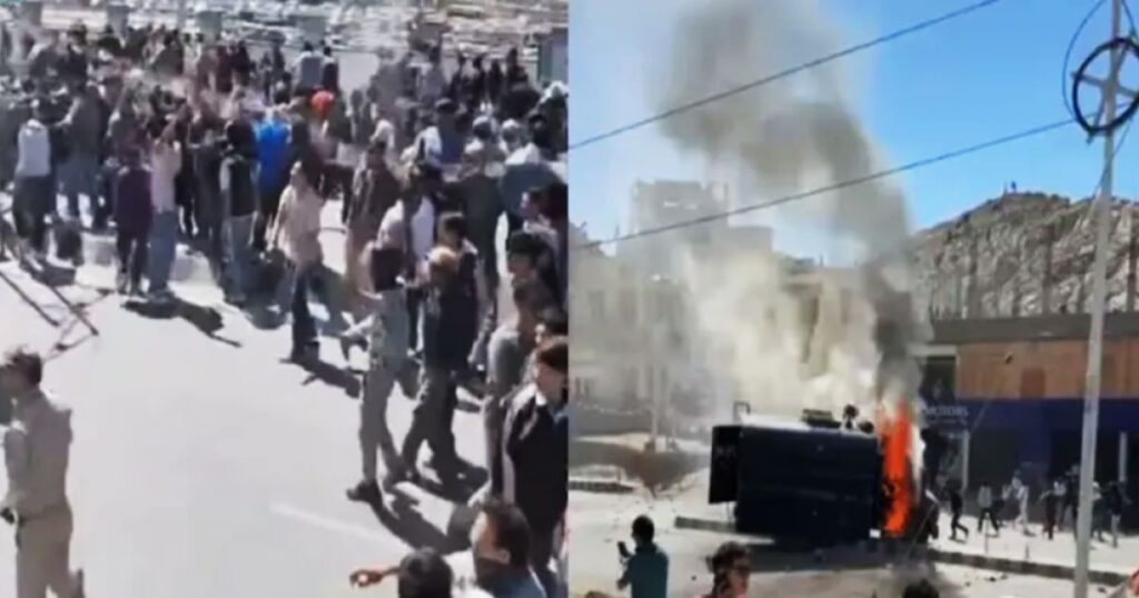 লাদাখের এই ছোট শহরে এখন হাড় কাঁপানো শীতের মধ্যেও বিক্ষোভের আগুন জ্বলছে। তরুণরা আলাদা রাজ্যের মর্যাদা ও সংবিধানের বিশেষ সুবিধার দাবি নিয়ে রাস্তায় নেমেছেন। দখলদারিত্বের জন্য কেন্দ্রীয় সরকারের বিরুদ্ধে হাতে আগুন দেন তারা। এমনই এক দৃশ্যের মধ্যে কেন্দ্রীয় সরকারের স্থানীয় কার্যালয়ে ইট-পাটকেলও ছোঁড়া হয়।