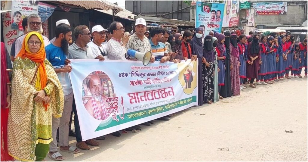 জামালপুরে এক শান্তিপূর্ণ মানববন্ধন ও সড়ক অবরোধের মাধ্যমে স্থানীয়রা গভীর ক্ষোভ প্রকাশ করেছেন এক ১১ বছরের শিশুকে ধর্ষণের অভিযোগে অভিযুক্ত সিদ্দিকুর রহমানের দ্রুত গ্রেফতার দাবিতে। ঘটনাটি ঘটেছে শহরের দড়িপাড়া এলাকায়। বিকালে, বৃহস্পতিবার (৯ অক্টোবর), স্থানীয় এলাকাবাসী দড়িপাড়া বাইপাস মোড়ে ব্যাপক আকারে এই প্রতিবাদ কর্মসূচি পালন করেন। ঘণ্টা ব্যাপী এই মানববন্ধনে বক্তব্য রাখেন মানবাধিকার কর্মী জাহাঙ্গীর সেলিম, বজলু মোল্লা, শাহাওয়াত হোসেন শুভ, আমির উদ্দিন প্রমূখ। জানা গেছে, ২৭ সেপ্টেম্বর দুপুরে শিশুটির বাবা-মা বাসায় না থাকার সুযোগে প্রতিবেশী সিদ্দিকুর রহমান শিশুটিকে ধর্ষণ করেন এবং সে ঘটনাস্থল থেকে পালিয়ে যান। শিশুটির মা বিলকিছ বেগম বাদী হয়ে জামালপুর থানায় একটি ধর্ষণ মামলাও দায়ের করেন। যদিও এখন পর্যন্ত পুলিশ অভিযুক্তকে গ্রেফতার করতে সক্ষম হয়নি। এ নিয়ে স্থানীয় মানুষরা খুবই উদ্বিগ্ন ও ক্ষুব্ধ, তারা তাদের ক্ষোভ প্রকাশের জন্য জামালপুর–টাঙ্গাইল মহাসড়ক এলাকাতে প্রায় এক ঘণ্টার জন্য যান চলাচল বন্ধ করে দেন, যার ফলে উভয় পাশে তীব্র যানজট সৃষ্টি হয়। এই পরিস্থিতিতে, শাহাওয়াত হোসেন শুভ ঘোষণা করেন, যদি ২৪ ঘণ্টার মধ্যে আসামিকে গ্রেফতার না করা হয়, তাহলে তারা আরও শক্তমুখী আন্দোলন ঘোষণা করবেন। পরে পুলিশ ঘটনাস্থলে উপস্থিত হয়ে অভিযুক্তের দ্রুত গ্রেফতার নিশ্চিত করার আশ্বাস দিলে, এলাকাবাসী অবরোধ ও মানববন্ধন কর্মসূচি প্রত্যাহার করেন।