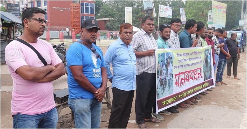 চট্টগ্রামের সীতাকুণ্ডের জঙ্গল সলিমপুর এলাকায় সংবাদ সংগ্রহের সময় হোসাইন জিয়াদ টেলিভিশনের ব্যুরো প্রধান ও পারভেজ রহমান চিত্র সাংবাদিকের ওপর সন্ত্রাসী হামলার ঘটনায় নওগাঁয় মানববন্ধন অনুষ্ঠিত হয়েছে। বৃহস্পতিবার সকাল সাড়ে ১০টায় শহরের মুক্তির মোড় শহীদ মিনারের পাশে কর্মরত গণমাধ্যমকর্মীদের উদ্যোগে এই ঘন্টাব্যাপী মানববন্ধন অনুষ্ঠিত হয়।