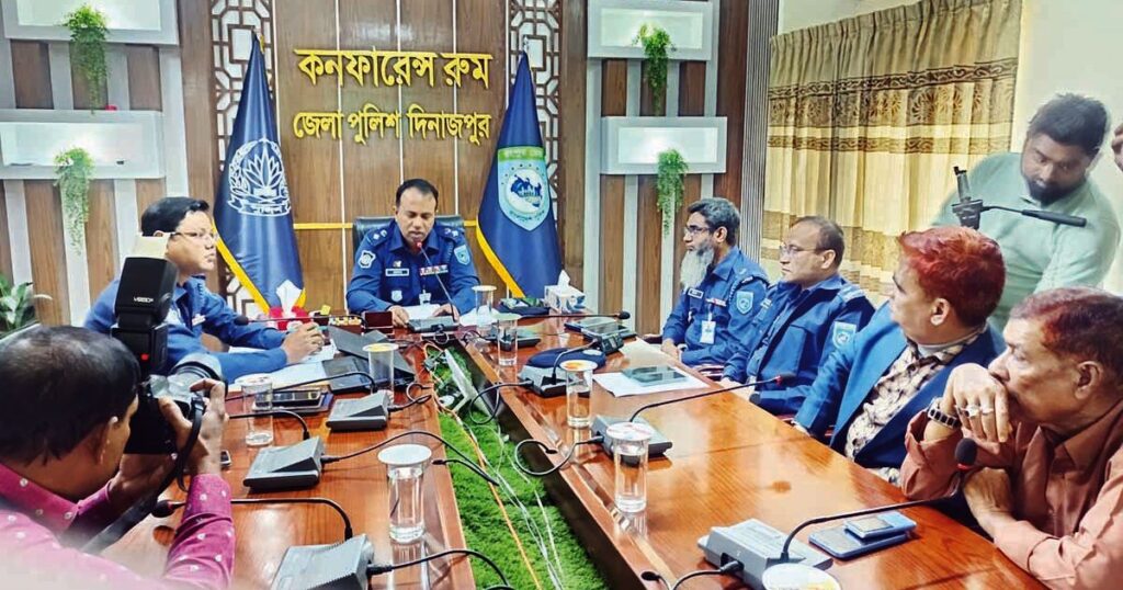 দিনাজপুরে সাংবাদিকদের সাথে এক গুরুত্বপূর্ণ মতবিনিময় সভা অনুষ্ঠিত হয়েছে। শনিবার সকাল ১১টায় দিনাজপুর পুলিশ সুপার কার্যালয়ের কনফারেন্স রুমে এই আয়োজনে এ বিশেষ সভা হয় যেখানে স্থানীয় সাংবাদিক নেতারা উপস্থিত ছিলেন। নবাগত পুলিশ সুপার মো. জেদান আল মুসা এসময় বলেন, মিডিয়ার গুরুত্বপূর্ণ ভূমিকা অপরিসীম। মানুষের বাকস্বাধীনতা রক্ষায় মিডিয়ার ভূমিকা অনস্বীকার্য। তিনি আরও বলেন, ‘দিনাজপুরের মানুষের সেবা করাই আমার মূল লক্ষ্য। মাদক সমাজের সব অপরাধের মূল উৎস। তাই বিভিন্ন পরিস্থিতিতে সমাজ থেকে মাদক নির্মূলে সবাইকে একসাথে কাজ করতে হবে।’ পুলিশ সুপার সমাজকে মাদকমুক্ত করতে এবং শহরের যানজট ও অন্যান্য সমস্যা সমাধানে সাংবাদিকসহ সংশ্লিষ্ট সকলের সহযোগিতা কামনা করেন। অনুষ্ঠানে উপস্থিত ছিলেন অতিরিক্ত পুলিশ সুপার মো. আনোয়ার হোসেন, মো. রফিকুল আলম, আব্দুল হালিমসহ পুলিশ বিভাগের বিভিন্ন পর্যায়ের কর্মকর্তারা। এছাড়াও, বিভিন্ন সংবাদসংস্থার সভাপতি, সাধারণ সম্পাদক, সাংবাদিক ইউনিয়ন নেতৃবৃন্দ ও জেলা পর্যায়ের সংবাদকর্মীরা এই মতবিনিময় সভায় অংশগ্রহণ করেন, যারা নিজেদের দৃষ্টিভঙ্গি ও মতামত তুলে ধরেন যেন অধিকতর সামাজিক উন্নয়ন ও অপরাধ নিরাপত্তা সম্ভব হয়।